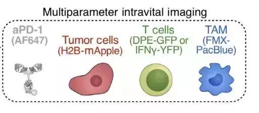 他們發(fā)現(xiàn)在結(jié)腸癌模型小鼠體內(nèi)注射標記的PD-1抗體5分鐘后,就在腫瘤微環(huán)境內(nèi)的T細胞上發(fā)現(xiàn)了染色標記。這是最早在腫瘤組織中檢測到被標記的細胞。研究人員觀察到,最開始標記的PD-1抗體結(jié)合到腫瘤浸潤T細胞周圍而幾分鐘后在T細胞表明形成色塊,之后,這些色塊被發(fā)現(xiàn)都在腫瘤相關(guān)巨噬細胞內(nèi)。