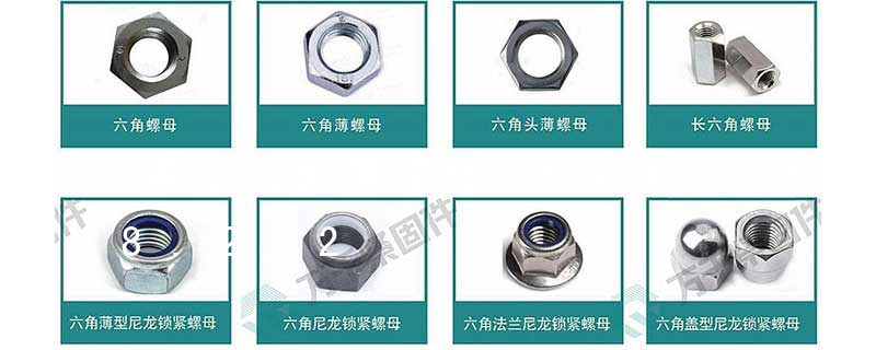 不銹鋼螺母:1. 包括六角螺母(GB6170/DIN934)、薄螺母(GB6172/DIN439)、重型螺母(公制、美制)、尼龍鎖緊螺母(DIN985-DIN982厚型)、全金屬鎖緊螺母(DIN980M)。2. 蓋型螺母(DIN1587)、法蘭面螺母(GB6177/DIN6923)、法蘭面螺母尼龍鎖緊螺母(DIN6926)、四角焊接螺母(DIN928)、六角